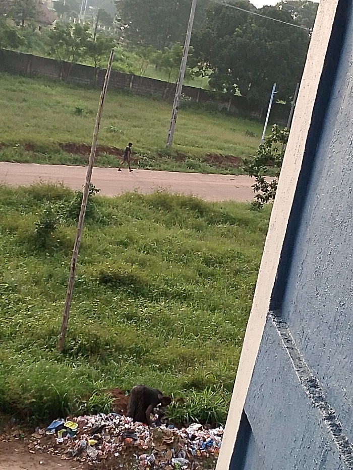This image depicts a roadside scene in Ihiagwa, Nigeria, characterized by both natural elements and human activity. In the immediate foreground, to the right, a section of a light blue-grey textured wall with a white trim is visible, suggesting the photograph was taken from an elevated vantage point. At the bottom left, a substantial pile of mixed refuse, consisting of various plastics and debris, is accumulated on the ground. A dark-clad individual, positioned with their back partially to the viewer, is observed hunched over this refuse pile, appearing to interact with or sort through its contents. Midground features include a light-colored unpaved road traversing horizontally across the frame. On this road, another individual, dressed in dark attire, walks from left to right, appearing barefoot. Several utility poles, some wooden and one with a blue upper section, are spaced along the road. The verges alongside the road and the areas beyond are covered in dense green grass and various shrubs. In the background, a low, dark-colored wall or fence runs horizontally, behind which a dense line of mature green trees is visible under a hazy sky.