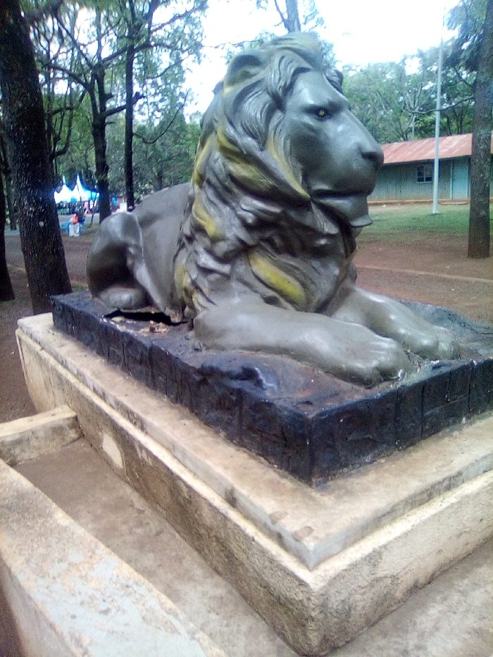 The image displays an outdoor scene in the city of West Sakwa ward, Kenya, featuring a weathered statue of a recumbent lion