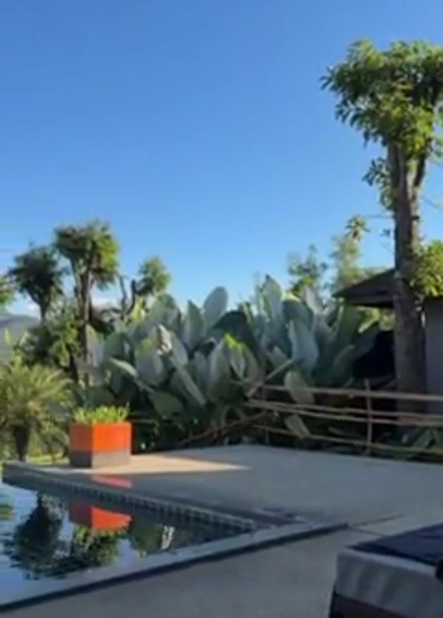 The video opens with a shot of a swimming pool in a tropical setting