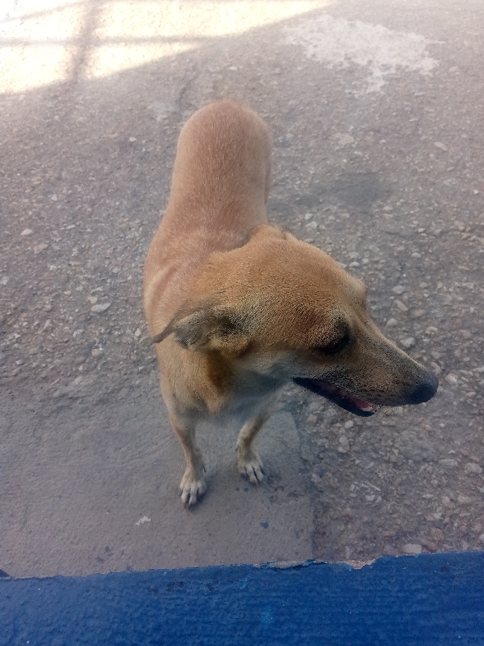 A tan dog stands on a textured concrete surface, viewed from above at an angle