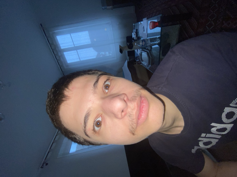 A close-up, wide-angle portrait depicts a male individual indoors in a room located in Strasbourg, France. The subject, a young adult with short, dark hair and a prominent thin mustache, stares directly at the camera with wide, brown eyes and a slightly open mouth. He wears a dark t-shirt featuring a partial white "adidas" logo on the chest. The background reveals a dimly lit interior space with light-colored walls. Two multi-paned windows, covered by sheer white curtains, are visible on the right side of the frame, emitting a cool, bluish ambient light. A dark-colored sofa or armchair is partially visible on the left. A rectangular glass-top coffee table in the middle-ground holds a plastic water bottle, a small mirrored tray, papers, a red glass, and a light-colored vase. A patterned rug is visible on the floor beneath the table.