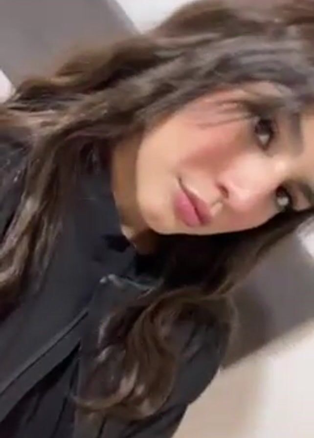 A young woman with long, wavy brown hair, wearing a black zip-up jacket, is looking at the camera. She has light skin, pink lipstick, and prominent eyelashes. She is positioned in front of a white wall, with a section of a gray couch visible in the upper left corner. The video is shot from a slightly elevated angle.