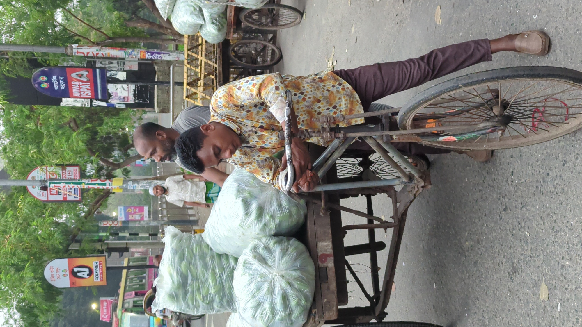 A man in a patterned shirt is fixing a bicycle rickshaw loaded with bags, possibly produce, in Dhaka, Bangladesh. Another man is standing nearby watching him. Street signs are visible, including advertisements and traffic instructions. The scene is on a street with greenery in the background.