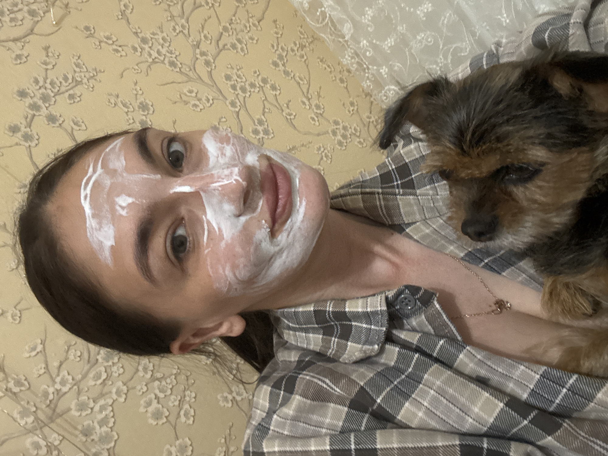 A young woman with a facial mask lies on a bed next to a small dog. She wears a gray plaid shirt and a thin necklace. The wallpaper behind her is light yellow with a floral pattern. There is no evidence to confirm that the location is in Sochi, Russia.