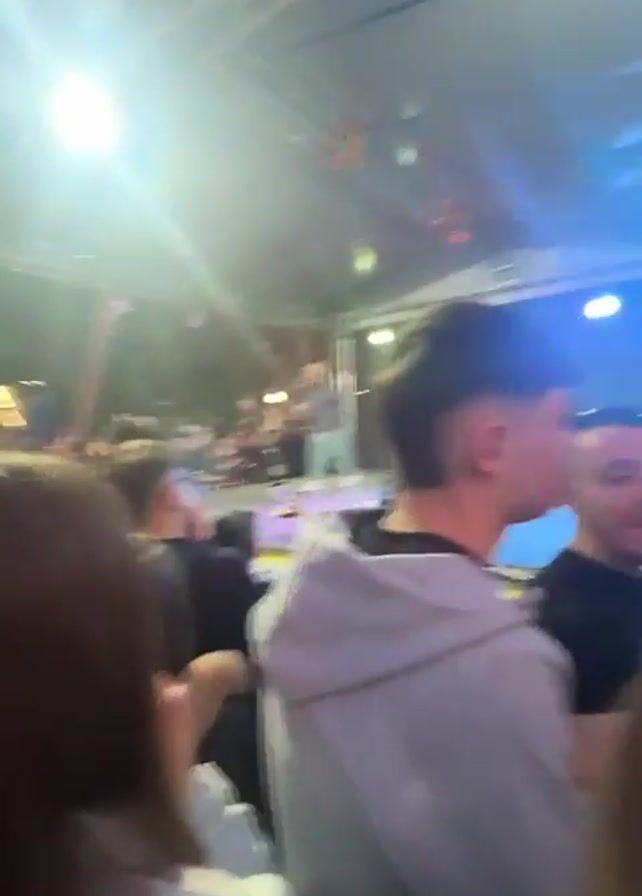 crowd of people at an outdoor concert or festival, with stage lighting illuminating the scene in varying colors. The camera moves through the crowd, focusing on a few individuals including a person in a grey hoodie, another in a black shirt, and a woman with long, brown hair who appears to be enjoying the music and dancing. The atmosphere seems lively and energetic.