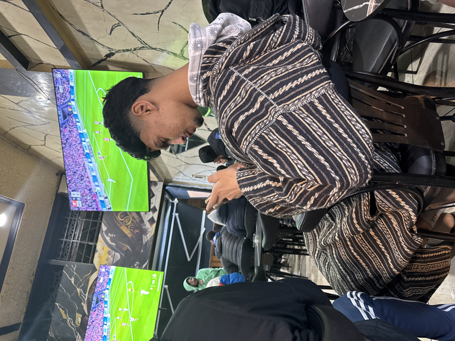 A person in a striped hooded jacket sits in a chair, facing a television screen displaying a soccer game. Other people are seated around, with additional screens showing soccer matches. The room has a modern design with marble-like walls and metal accents. The person in the jacket appears to be using their mobile phone.