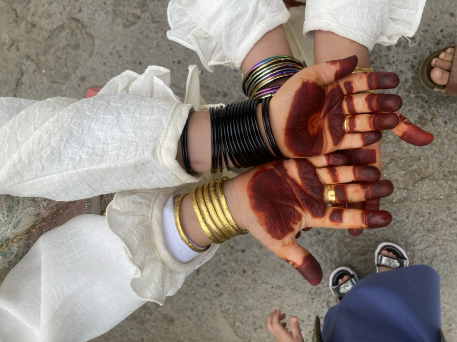 This image, captured in Quetta City Tehsil, Pakistan, displays a close-up overhead view of four human hands, likely belonging to two individuals, positioned with palms open and facing upwards. Both visible palms and fingers are covered in dark reddish-brown henna (mehndi) designs. The hand on the left wrist is adorned with at least six gold-colored bangles and a single gold-colored ring on one finger. A white, textured garment sleeve with a ruffled cuff is visible, along with a white sock peeking from beneath the cuff. The hand on the right wrist wears numerous black bangles and a stack of multi-colored metallic bangles. A single gold-colored ring is present on one finger of this hand. A similar white, textured garment sleeve with a ruffled cuff is visible on this arm. In the lower-left quadrant, a child's left hand and forearm are partially visible, wearing blue trousers and black and white open-toed sandals. In the lower-right quadrant, a foot wearing a brown open-toed sandal is partially visible. The background consists of a rough, light gray concrete or paved surface.