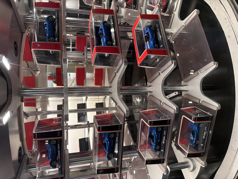 The image displays a multi-tiered, rotating retail display unit showcasing scale model cars within an indoor commercial establishment, specifically the Ferrari Store in Milan, Italy