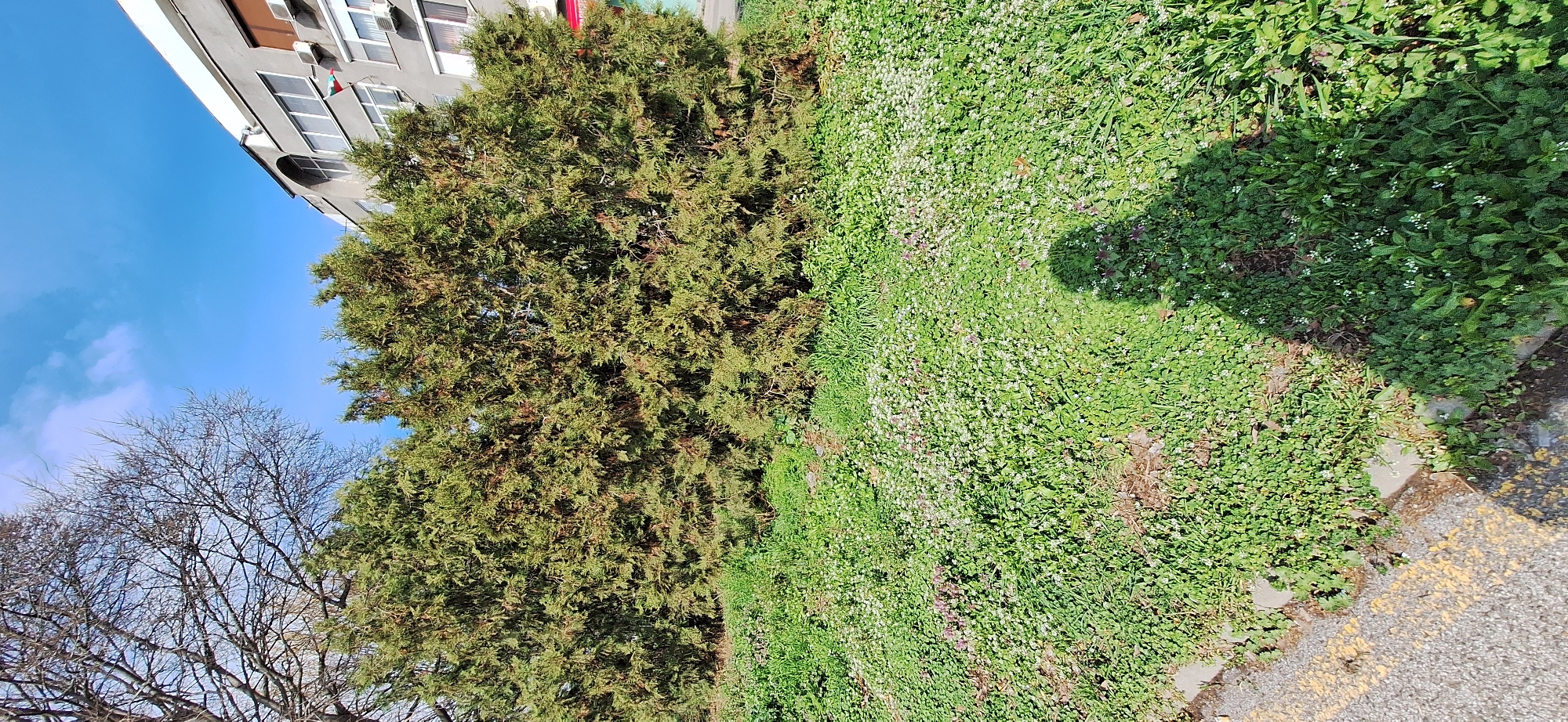 The image depicts a street scene in Burgas, Bulgaria. The frame is angled upwards, capturing a partial view of a multi-story grey building with windows. A conifer tree dominates the center of the frame, its dense green foliage filling a large portion of the image. To the right, ground cover with small white flowers extends to the edge of a paved area marked with a yellow stripe. A leafless tree is visible on the left, and a blue sky with some clouds fills the upper left corner. A shadow is cast on the ground cover, possibly from the photographer.