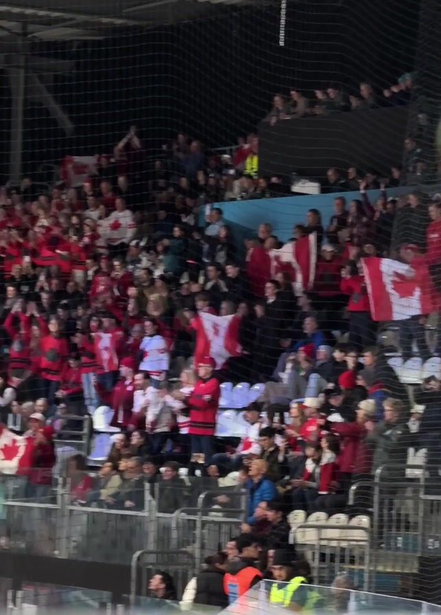 crowd of people at a hockey game, most wearing red and waving Canadian flags. The crowd is seated in bleacher-style seating in an arena. A safety net is visible in the foreground, obscuring the view slightly. The lighting is bright, and the atmosphere appears lively and enthusiastic.