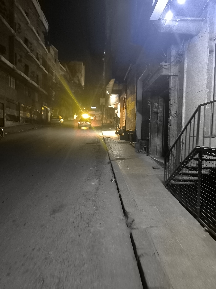 A nighttime street view features a row of old buildings on the left and a taller building on the right with a staircase and metal railing. A car with bright headlights approaches in the distance. The street and sidewalk are lit by the car's headlights and streetlights, casting long shadows. The overall scene is dark and gritty, capturing the urban environment at night.