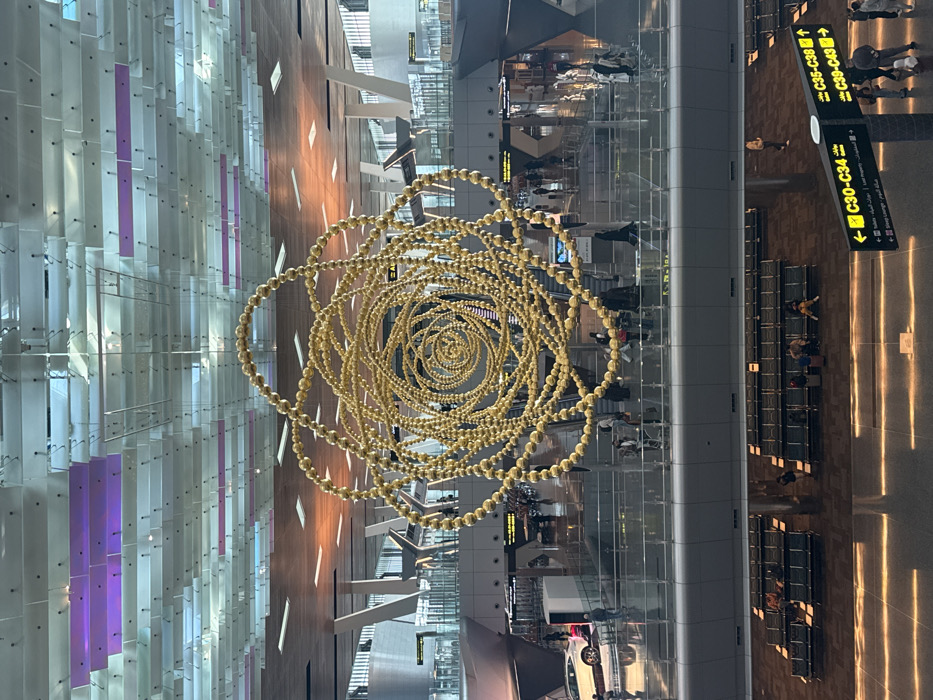 This image depicts the interior of Hamad International Airport in Doha, Qatar