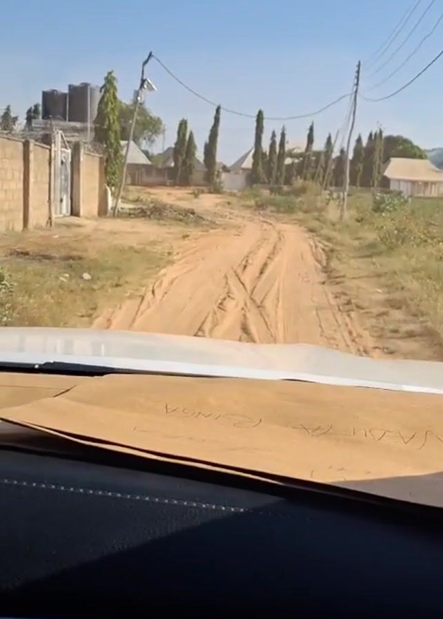 vehicle driving down a sandy, dirt road. The road has visible tire tracks. On either side of the road, there are various buildings, some with walls, and a few tall, thin trees. Power lines stretch across the sky above. In the foreground, inside the vehicle, there are a couple of brown envelopes on the dashboard. The sky is clear and blue.