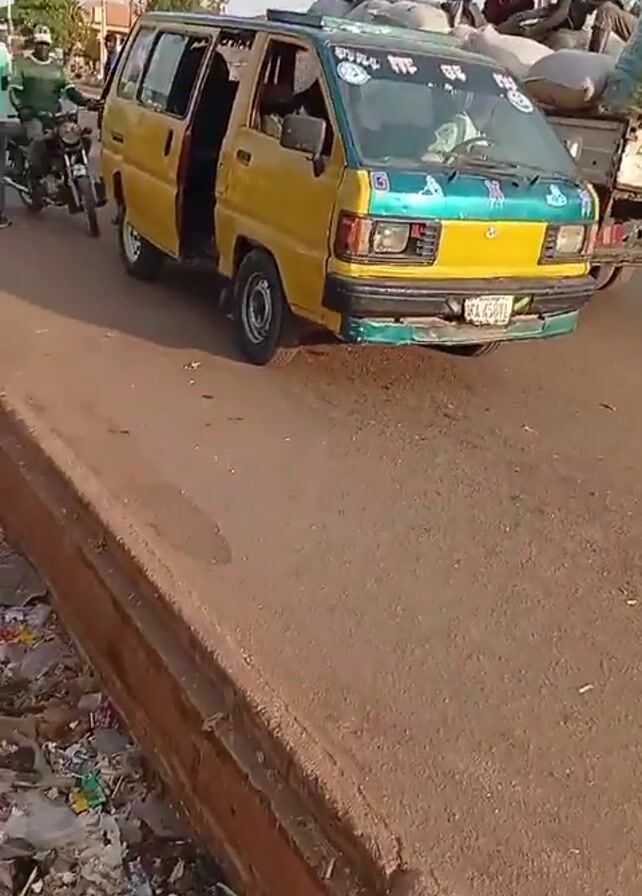 yellow van parked on the side of a road, with multiple people sitting on its roof. The van's side door is open. Next to the van is a small truck filled with large sacks. A motorcycle passes in front of the van. There are people walking around the vehicles. The road is asphalt with a concrete divider, and there is trash in a ditch alongside the road. Overhead power lines are visible. The overall environment suggests a moderately populated area with active transportation.