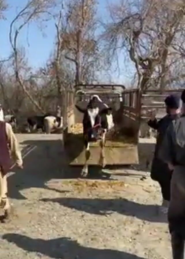 two men walking a black and white cow off of a trailer and onto the ground. One of the men is wearing a gray garment and black rubber boots. He is holding a red rope attached to the cow's head. The other man is wearing a traditional outfit including a tan garment and a hat. The area is a dirt yard with bare trees. There are other cows visible in the background and some vehicles. The day is sunny with a blue sky.