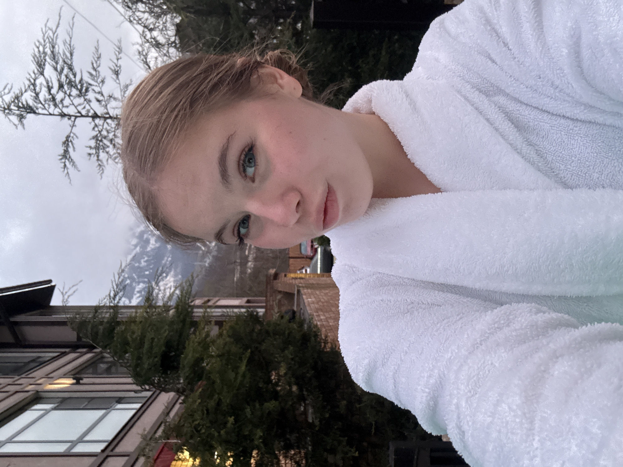 fair-skinned woman wearing a white bathrobe, posing outdoors in Estosadok, Russia. Behind her is a building with multiple windows, a dense evergreen tree, and a mountain range partially obscured by clouds. The photo appears to have been taken at dusk or dawn, given the soft, overcast lighting.