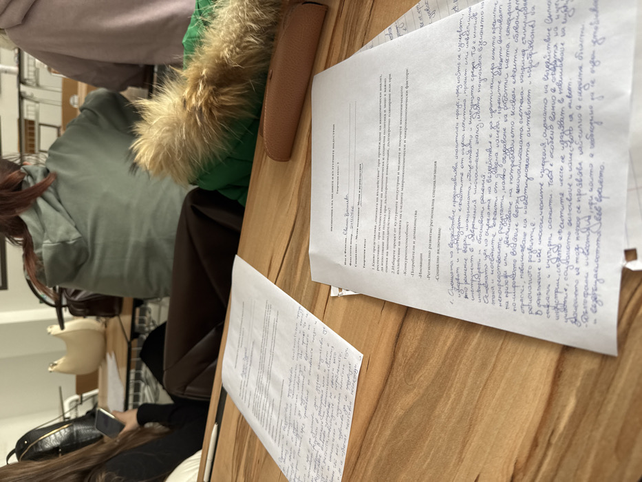 The scene depicts an interior view of an academic institution in Sofia, Bulgaria, likely a university classroom or study hall. The image is captured from a slightly elevated perspective, focusing on a light-colored wooden table and individuals seated beyond it. In the immediate foreground, two sheets of white paper are present. The paper on the right is a printed assignment or exam titled "ИКОНОМИКА НА МЕДИИТЕ И КУЛТУРНИТЕ ИНДУСТРИИ" (Economics of Media and Cultural Industries), displaying questions and substantial handwritten answers in blue Cyrillic script. The paper on the left contains extensive handwritten notes, also in blue Cyrillic. A black pen with a white tip rests between the two papers. A brown, textured glasses case is partially visible on the table to the right. Three individuals are seated in the midground, primarily viewed from behind. The person on the left has long, straight brown hair, wears a dark long-sleeved garment, and is holding a white smartphone in their left hand. A black backpack with metallic buckles is visible behind their chair. The central individual wears a light green hooded sweatshirt and has reddish-brown hair. A green jacket with a prominent light brown fur-trimmed hood is draped over a chair or table in front of this person. A third individual, wearing a light purple hooded sweatshirt, is partially visible on the far right. The background reveals a light-colored wall and glimpses of other tables and chairs, including a white handbag with distinctive top handles resembling ears, placed on a table further back. The arrangement of people and academic materials suggests an ongoing class, lecture, or study session.