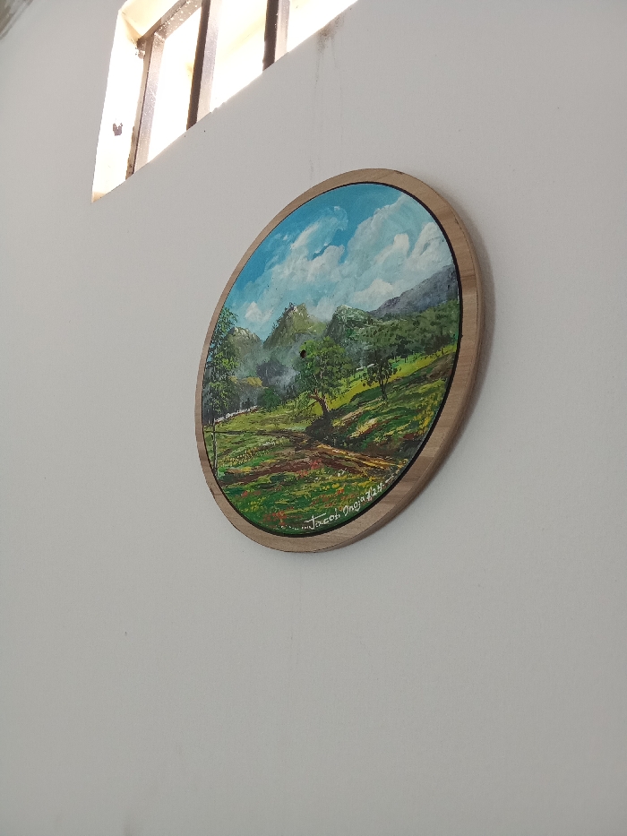 An indoor scene in Jos, Nigeria, displays a circular landscape painting centrally mounted on a plain white wall