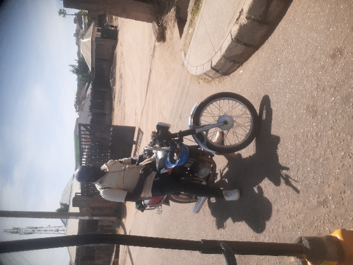 The image captures an outdoor scene in the city of New Stadium, Nigeria, under clear, bright daylight. An adult male, of dark complexion, is seated on a motorcycle on an unpaved road. He wears a light-colored short-sleeved collared shirt, dark trousers, and white athletic shoes, and is looking towards the right side of the frame. The motorcycle has a blue and red fuel tank, silver handlebars, and a silver front fender. Distinct shadows of the man and the motorcycle are cast on the dusty, light-colored road surface. To the right, a concrete curb marks the edge of a raised pathway. In the background, a residential area is visible, featuring various houses with light-colored roofs, perimeter walls, and a prominent dark metal gate. A tall telecommunications tower is present in the distant left background, and sparse vegetation is visible amidst the structures and hilly terrain.