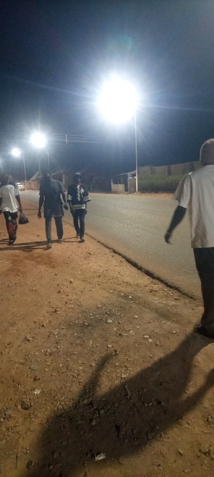 A group of people walk along a street at night, illuminated by bright streetlights. They appear to be in a residential area with houses visible in the background. The foreground shows a dirt shoulder next to the paved road, with the shadow of a person in the right-hand corner.
