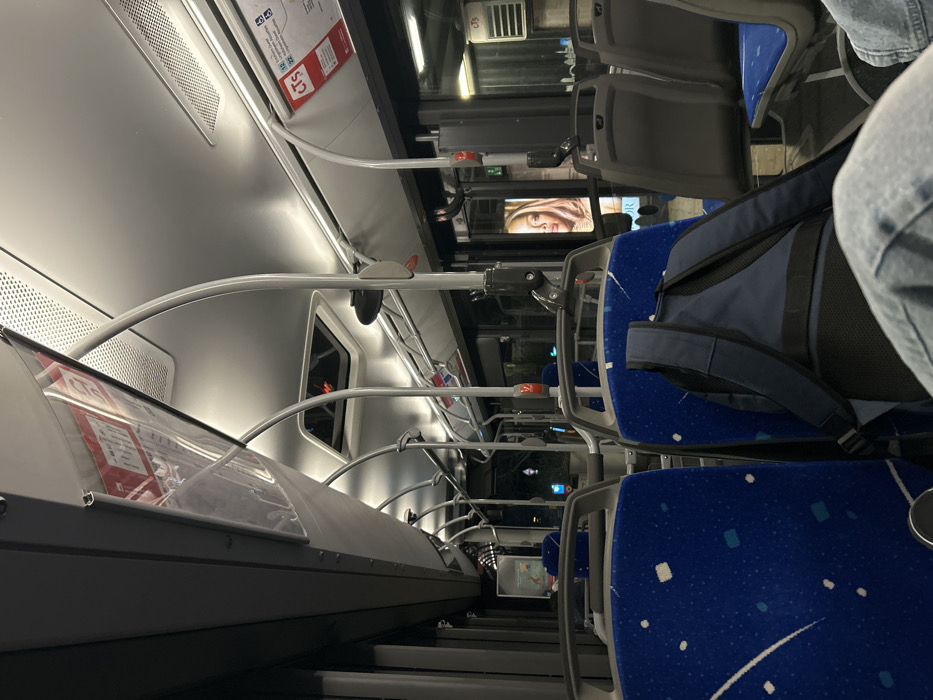 The interior of a public transportation vehicle, possibly a bus or train, is shown. Rows of blue, patterned seats are visible, some occupied or with bags on them. Overhead handrails curve along the ceiling. Advertisements are placed in designated spots. The lighting is bright and fluorescent. Windows show glimpses of the outside, appearing to be nighttime. The vehicle is in motion.
