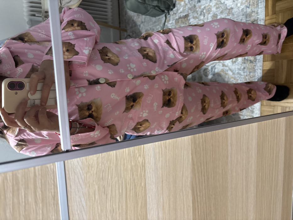 A person is captured in a mirror selfie within an indoor residence in Clichy, France. The individual is wearing a pink pajama set patterned with repeated images of Persian cat faces (some adorned with sunglasses), white paw prints, and white fish skeletons. The pajamas consist of a long-sleeved button-down top and matching long pants. The person holds a light-colored smartphone with a dual-camera system in their right hand, positioned to take the photograph. A ring is visible on the left ring finger, and bracelets are present on the left wrist. The individual's feet are clad in black socks. The reflection reveals a patterned rug on the floor transitioning to a light-colored wooden floor. A white radiator is visible on the far right against a light-colored wall, with a gray or olive-green bag resting on the floor beneath it. To the left of the mirror's reflection, a light-colored wooden surface, likely a piece of furniture, is visible.
