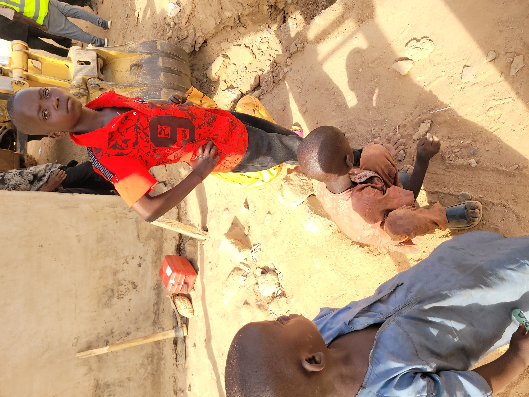 The image depicts an outdoor scene in Nassarawa Egon, Nigeria, characterized by dry, light brown soil and an apparent construction or excavation site. In the foreground, three children are present. A young male, approximately 8-10 years old, stands centrally, facing the viewer with a neutral expression. He wears a short-sleeved red collared shirt with black abstract patterns and a prominent black number "9" on the front, along with dark trousers. His hands are positioned on his hips. To his left, another young male, of similar age, is partially visible from the chest up, facing right. He wears a light blue, possibly soiled, long-sleeved garment and holds a small, light green object in his right hand. To the right and slightly in front of the central child, a third young male, likely younger than the other two, crouches on the ground. He wears a light brown tunic and dark sandals, focusing his attention on small rocks and debris on the ground, manipulating them with his hands near a slender white object. The background reveals a construction environment. A large yellow excavator bucket is prominently positioned to the right of the central child, partially submerged in an excavated trench. Behind the excavator, several adult figures are partially visible; one wears grey trousers and a yellow high-visibility vest, another wears dark attire. To the left, a light-colored, possibly mud or concrete, wall stands, against which a wooden-handled pickaxe is leaned. On the ground near the wall, a red plastic container with a white label and a woven, natural fiber object are present. The ground throughout the scene is marked by small rocks, dirt, and varied textures indicative of excavation. Strong shadows cast on the ground suggest bright daylight.