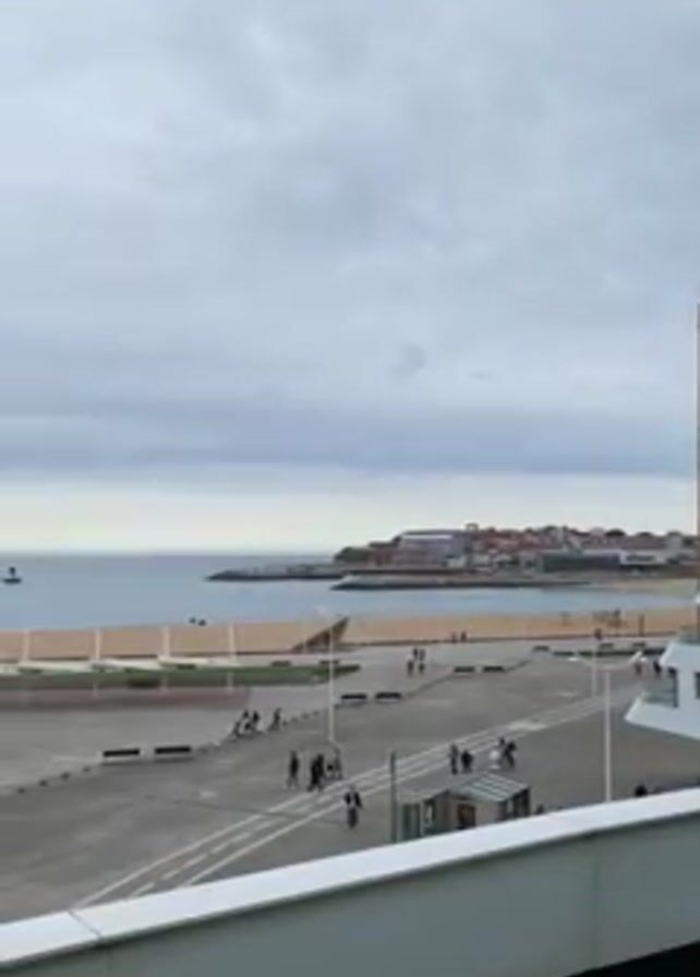 view of a seaside promenade on a cloudy day. The promenade is mostly paved with some grassy areas and benches. People are walking around. In the background, there is a beach and the sea. On the right, a part of a building is visible, including a tall, cylindrical brick chimney. The camera appears to be positioned on a balcony or higher level of a building overlooking the promenade.