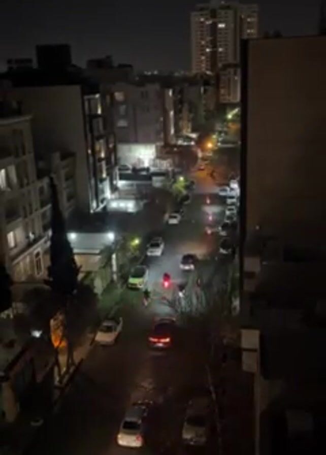 n elevated view of a street at night. The street is lined with buildings of varying heights, with a taller building visible in the distance. Streetlights illuminate the road, where several cars and motorcycles are moving. Some vehicles have headlights on, adding to the illumination. The sky is dark, and the overall lighting suggests it is nighttime. There is sound of speech audible in the background.