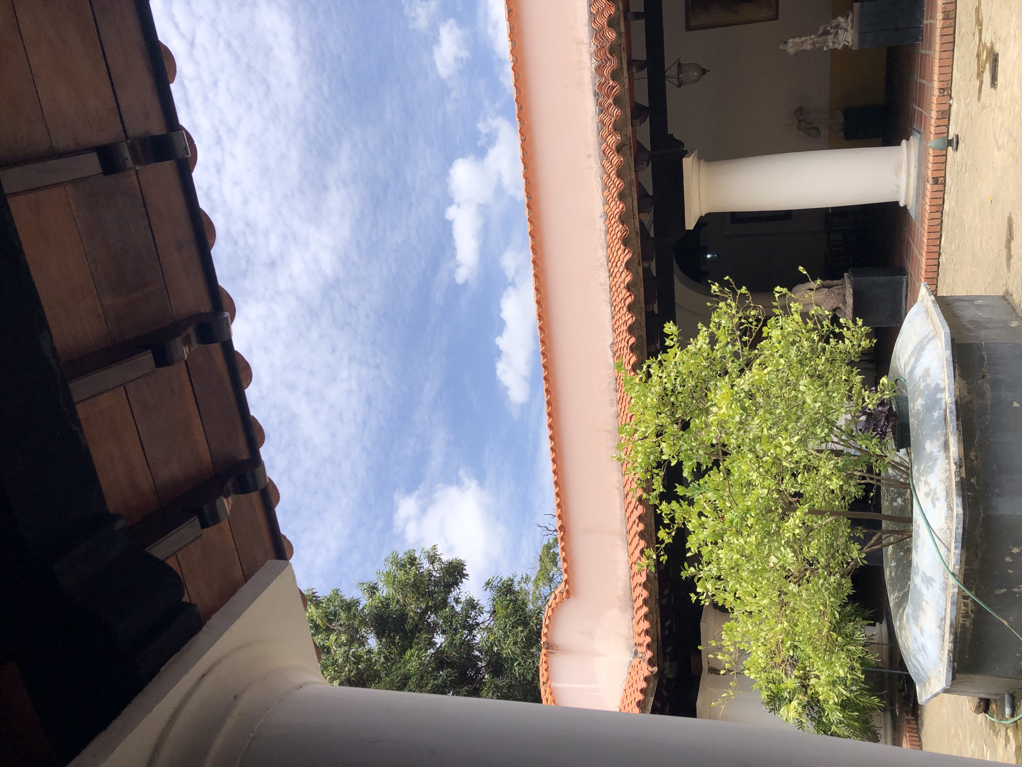 Captured from a low-angle perspective, the image frames a scene within El Valle del Espíritu Santo, Venezuela. The right side of the image features a building with a pale pink exterior and a terracotta tiled roof. A tree in a planter stands in front of the building, with green foliage and a view into the building's interior, where a white column and dimly lit space with statues are visible. Above, a blue sky is dotted with scattered white clouds. The left side of the image shows a different building with a similar terracotta tiled roof, obscuring some of the view. Green trees are also visible in the background, further away from the buildings. A white column occupies the bottom left corner.