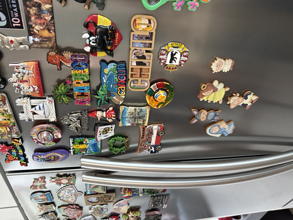 A stainless steel refrigerator is covered with an array of magnets. Destinations include Spain, Cancun, Mexico, Berlin, and what appears to be Chemo. Figurines of animals, angels, and a baby in a manger are also present. The refrigerator features curved, tubular handles. Other magnets include artwork or landscapes, and some seem to be souvenirs.