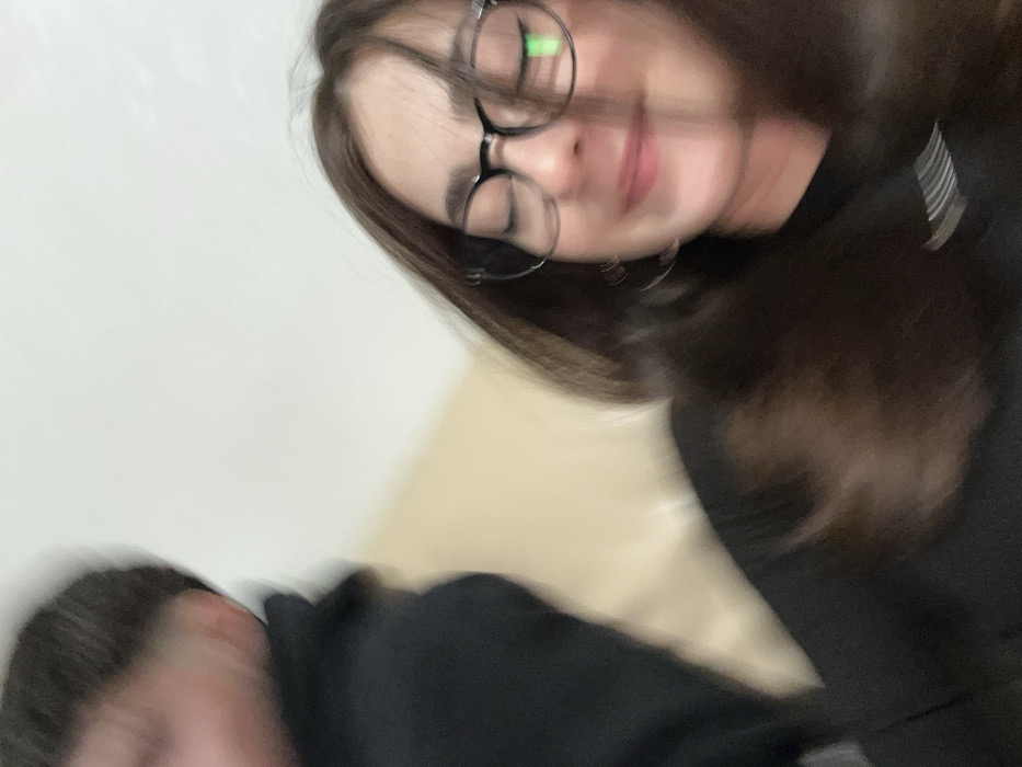 A slightly blurred photo shows two people. The person in the upper right wears glasses and a black top. Their hair is long and brown. A white wall is in the background. The second person is partially visible in the lower left corner and is wearing a black hoodie. The angle of the photo is off-kilter.