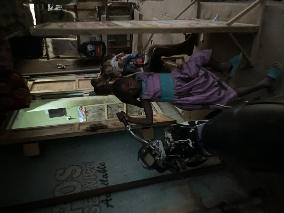 The image depicts a crowded, semi-outdoor scene in Chikaji, Nigeria. In the immediate foreground on the left, a black motorcycle is parked, its handlebars and front section visible. A young Black girl, approximately 5-7 years old, stands beside the motorcycle, gripping its right handlebar with her left hand. She wears a purple dress with a teal waist band and light blue sandals, looking directly at the viewer with a neutral expression. To her right, further into the scene, three individuals are seated on a wooden bench. Two adults, both appearing to be Black, are present; one adult is holding an infant. The infant is dressed in light clothing, including blue jeans. The seated adults are partially obscured by a light-colored wooden frame structure on the far right of the image. On the left side of the scene, a teal-colored wall bears the painted white text "POS SERVICE" and "Available", indicating a Point-of-Sale service. An open wooden door leads into a brightly lit interior space with light green walls. A small, dark-colored television is mounted on the far wall inside this room. Above the seated individuals, a blue backpack featuring a white cartoon character design is visible, hanging from a fixture. The ground beneath the subjects appears to be a mix of dirt and uneven pavement.