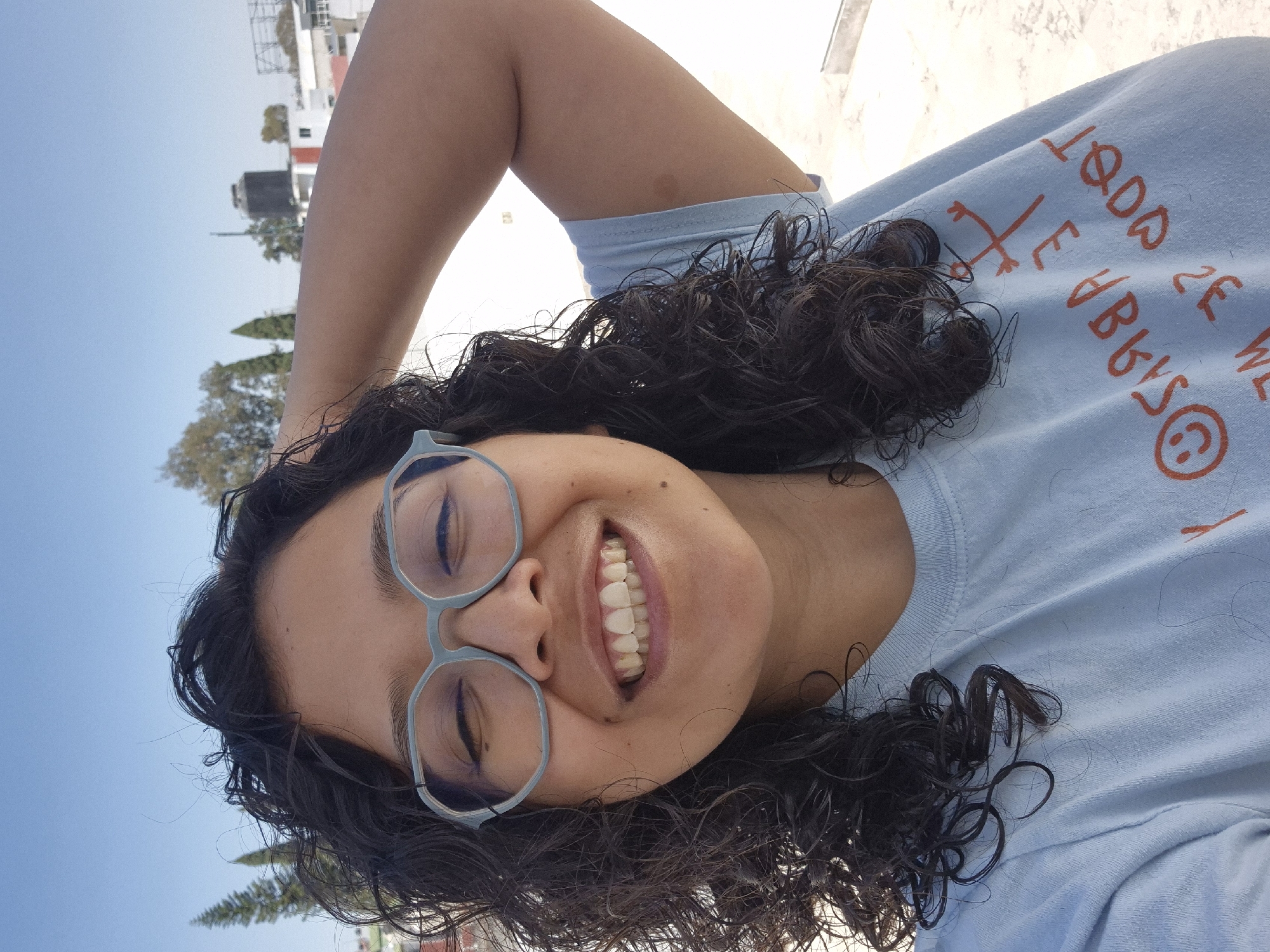 The image displays a headshot selfie of a single individual, a female with medium complexion and dark, curly hair, posing outdoors under bright sunlight. She is wearing light blue, polygonal-framed eyeglasses and a light blue t-shirt featuring reversed red-orange text and a smiley face graphic. Her face is centered, exhibiting a broad smile with visible upper and lower teeth, and her eyes are squinted. Her right arm is raised, with the forearm and bicep visible on the right side of the frame, suggesting her hand is positioned behind her head or neck. The background reveals an urban or suburban rooftop environment with a clear blue sky. Distant elements include several trees, various light-colored buildings, a black rooftop water tank, and a large metal structure, possibly a billboard frame. The specific location within the city of Puebla, Mexico, cannot be determined from the visual evidence.