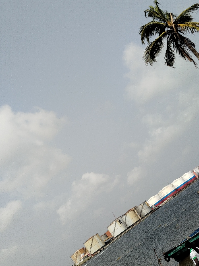 The image, captured with a visible tilt, presents an industrial waterscape in Ibasa, Nigeria, under an overcast sky featuring scattered white clouds. A palm tree with green fronds is partially visible in the upper right quadrant. Along the opposite bank, a line of large cylindrical industrial storage tanks stands beside dark, rippled water. Several tanks are off-white, while others display horizontal stripes of white, blue, and red. In the lower right foreground, a green boat is partially visible on the water, with an individual in a white shirt with green accents positioned within or near it.