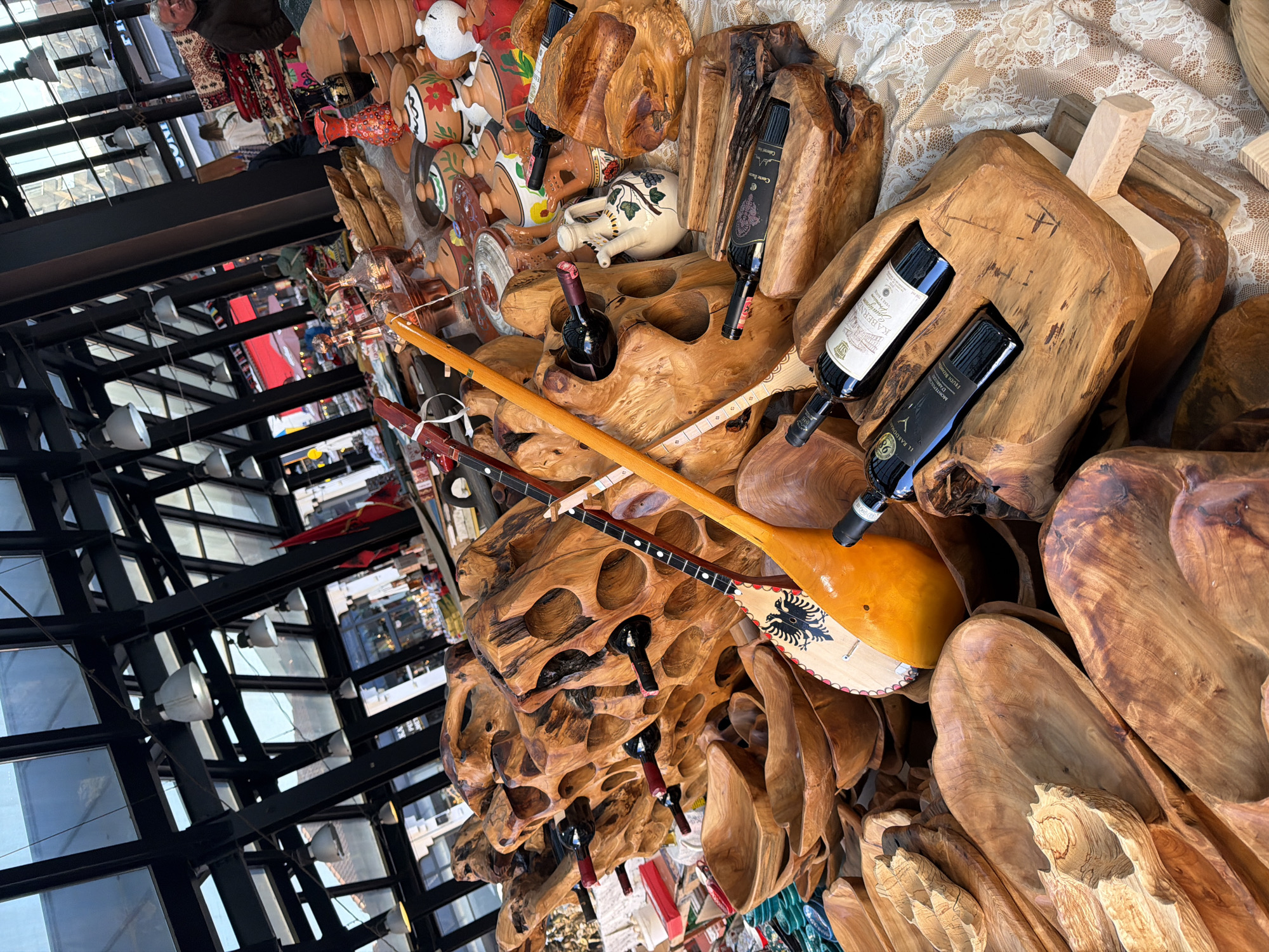 n array of handcrafted wooden items for sale, including bowls, wine holders, and a musical instrument resembling a lute. The objects are densely packed on a display surface. Wine bottles are inserted into some of the wooden holders. A wooden lute-like instrument with an eagle design on its body lies across the display. The background reveals the modern architecture of a building with a glass ceiling and metal support beams. Based on the style of handicrafts, particularly the lute-like instrument bearing the Albanian eagle, and the architecture, this scene is likely located at a craft market or shop in the city of Tirana, Albania.