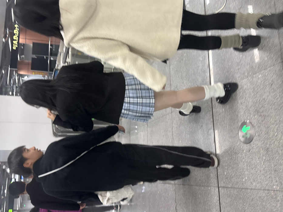 Three people walk on a gray tiled floor. One wears a cream-colored coat and black leggings with light brown leg warmers. The second person has a black sweatshirt, a blue plaid skirt, and white leg warmers. The third person is wearing a black tracksuit with a white strap. The people seem to be at an airport or train station. There is a green illuminated arrow on the floor.