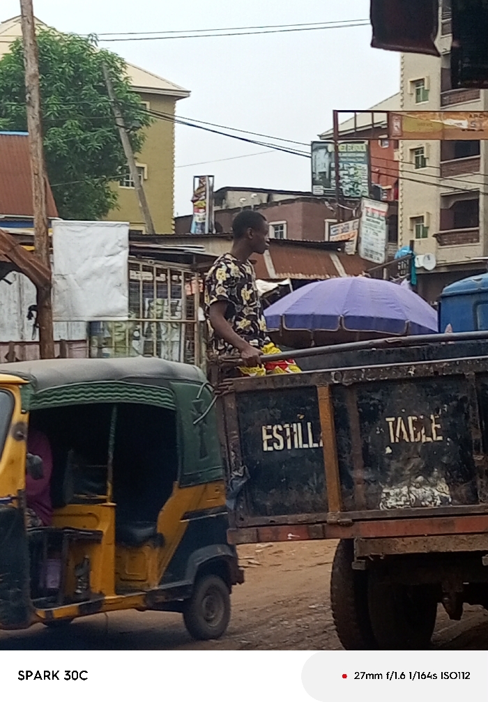 A man rides atop a flatbed trailer hitched to a yellow and green auto rickshaw. The trailer, labeled “ESTILL” and “TABLE,” appears worn and dusty. Overhead, a lavender umbrella shades a nearby vendor. The rickshaw is parked on a street surrounded by buildings and various signage. Above the street, tangled power lines weave between buildings, with trees and overcast skies forming the backdrop.