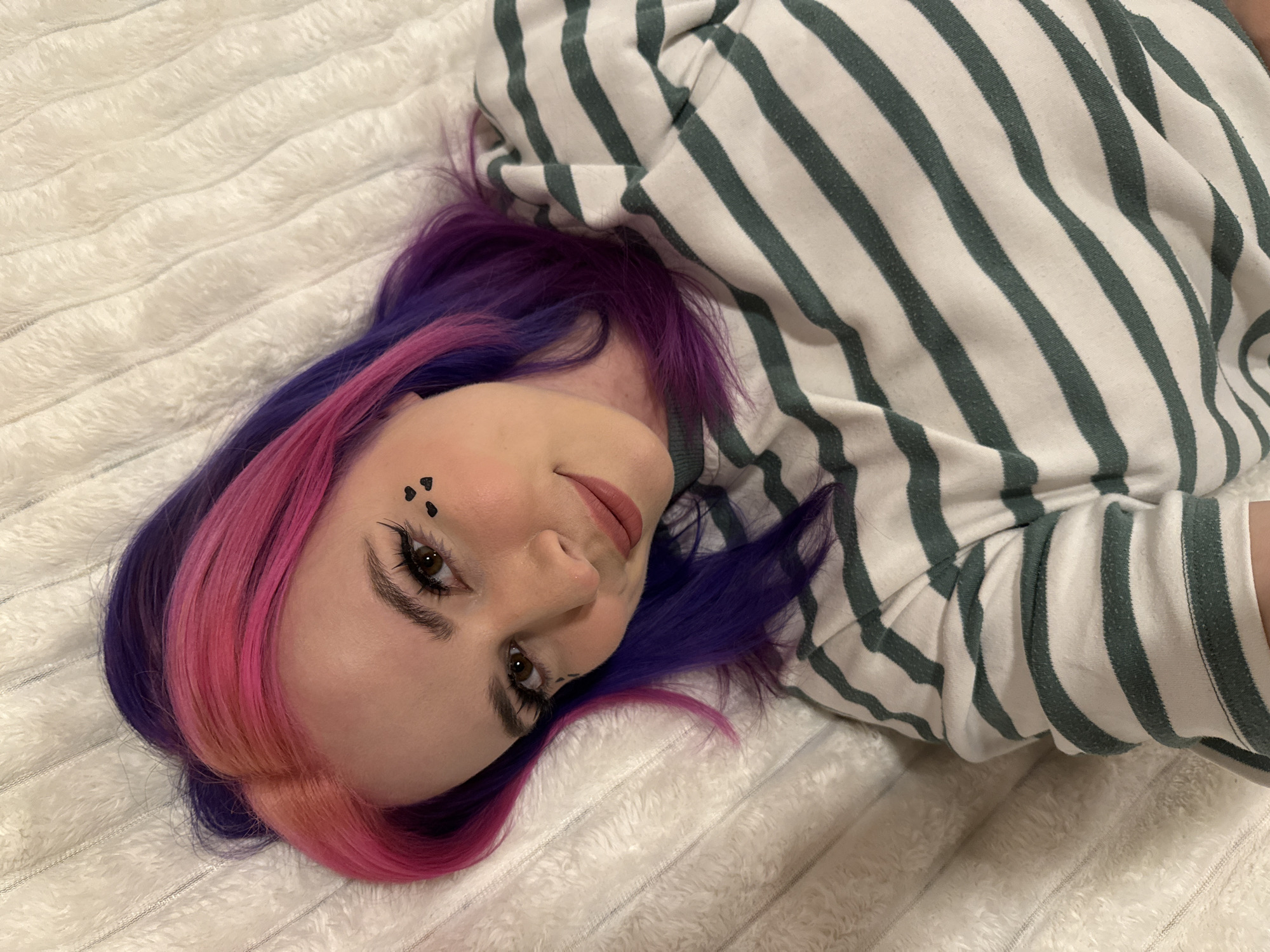 A young person lies on a white textured surface, presumably a bed or blanket. They have pink and purple dyed hair. Three small black heart shapes are visible above their eyebrow. They are wearing a striped long-sleeve shirt. The location is unknown and is not possible to be determined from the information contained in the image.