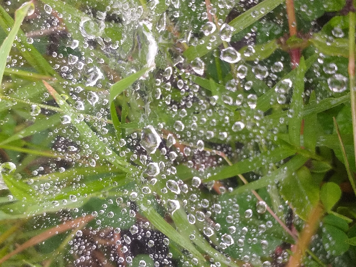 - "A close-up shows blades of green grass interspersed with a spiderweb covered in numerous water droplets" by FM-lF8872, licensed under CC BY 4.0