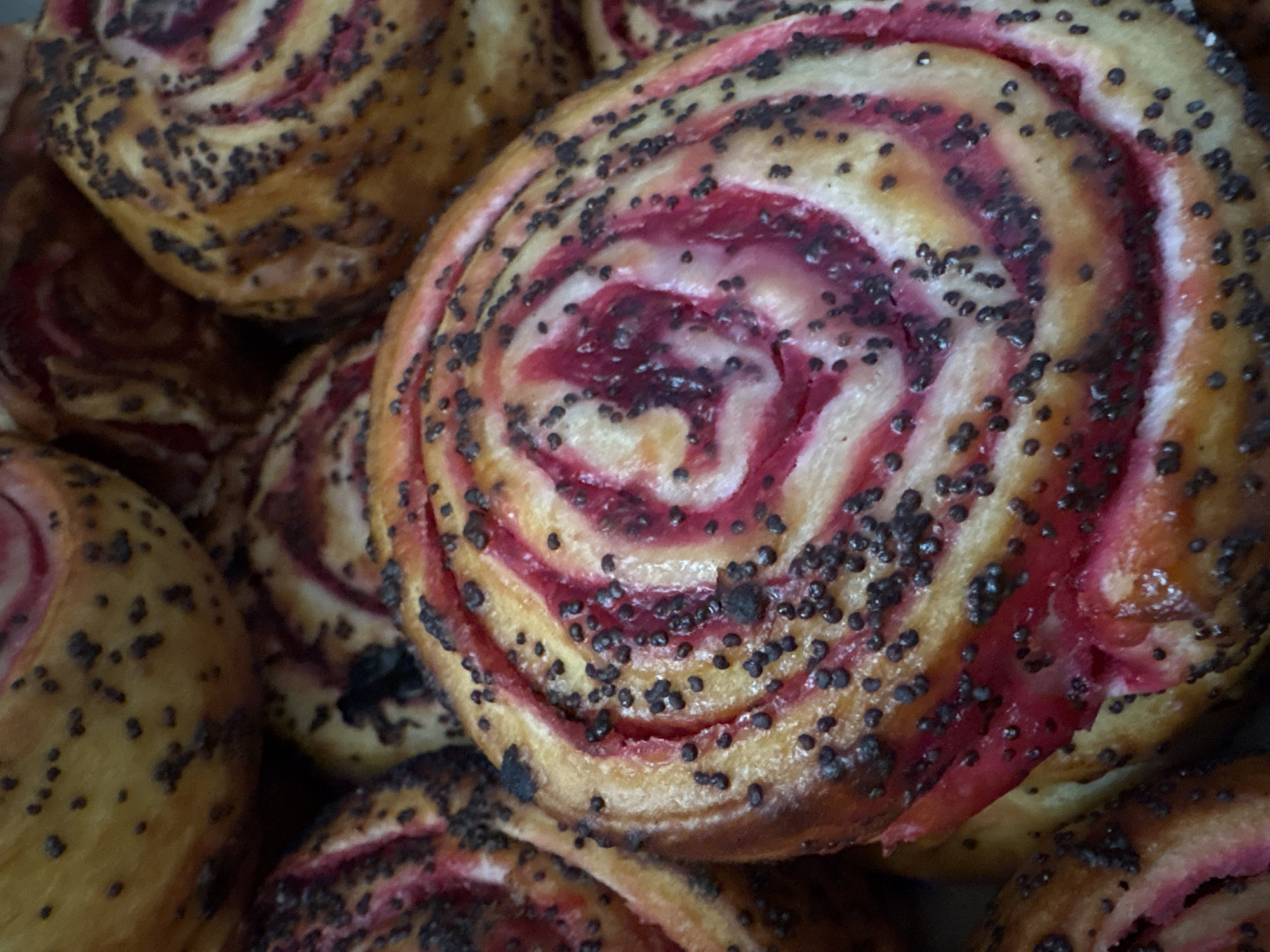 close-up of a pile of sweet rolls. The rolls have a spiral pattern with alternating layers of light dough and a dark red filling. The tops of the rolls are sprinkled with poppy seeds. The background is slightly blurred, suggesting a shallow depth of field. The location of Rusalevka, Russia, is not discernible from the image alone.
