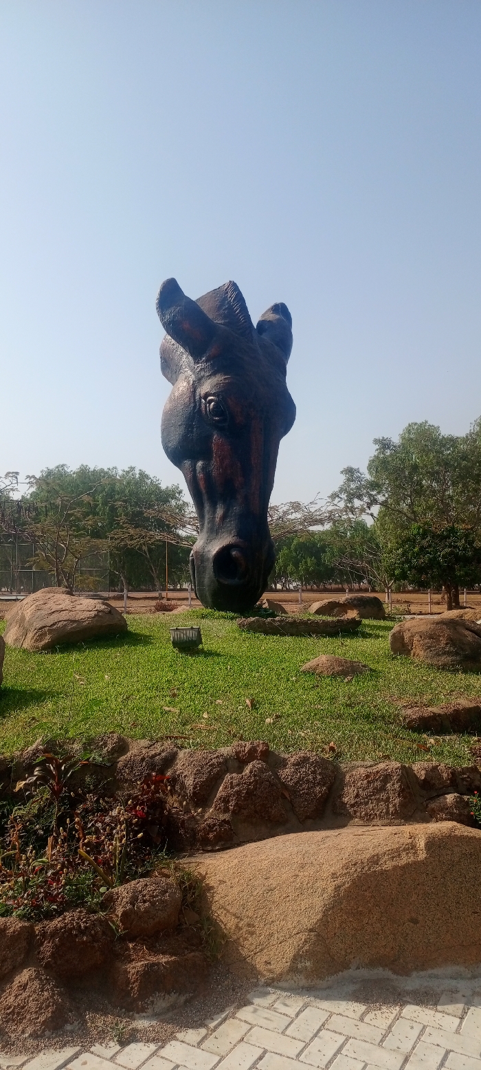 A large, dark-colored horse head sculpture dominates the scene in a park-like setting