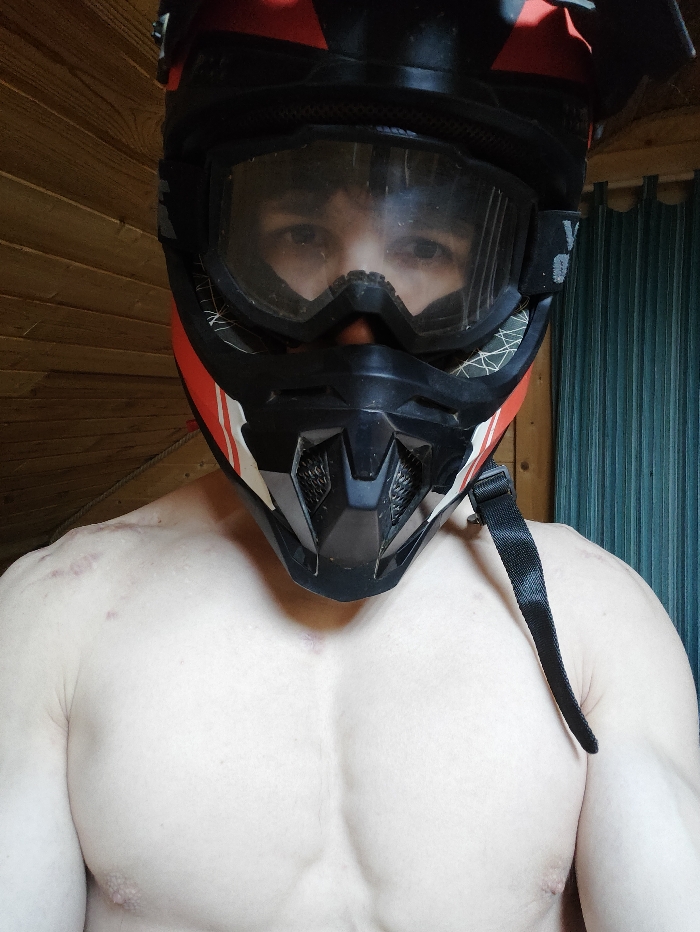 A shirtless man dons a red, white, and black motocross helmet with goggles. His physique is visible, revealing defined pectoral muscles. The background features wood paneling and a blue curtain, suggesting an interior setting. Scars are visible on his upper body.