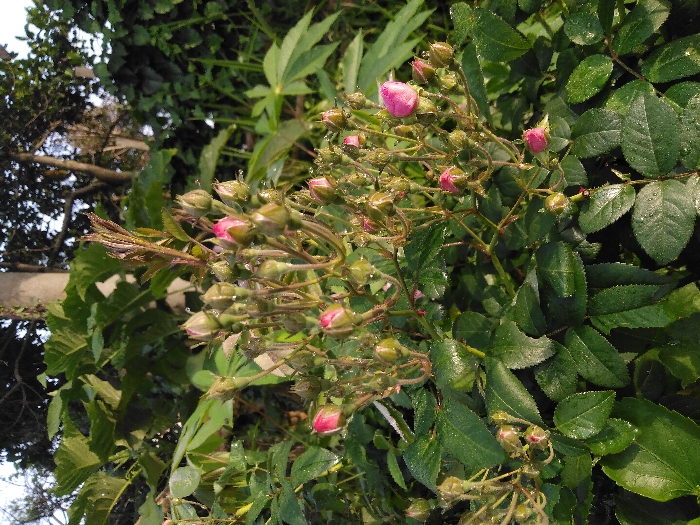 The image displays a close-up, eye-level view of a rose bush located in Mouangkeo, Laos. The primary subjects are numerous small pink rose buds and a few partially opened pink roses, clustered together on green stems. The plant features abundant dark green, ovate leaves, many of which are visibly wet with water droplets, suggesting dew or recent rain. New, reddish-brown foliage sprouts are present among the buds. In the blurred background, various green foliage elements are discernible. A light-colored, vertical pole-like structure is visible in the upper left background, and dark tree branches are silhouetted against a brighter, overcast sky in the upper right. No individuals, animals, or specific actions are depicted within the frame.