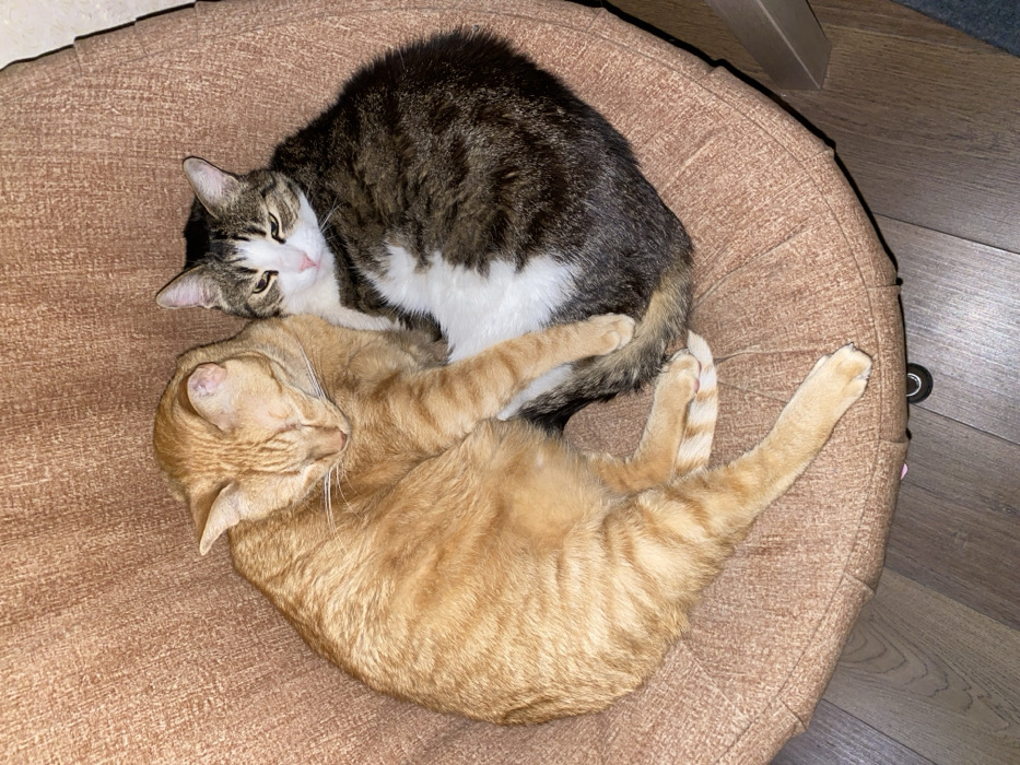 - "An orange tabby cat and a brown, black, and white tabby cat are observed resting in physical contact on a light brown, textured pet bed" by FM-uK62y1, licensed under CC BY 4.0