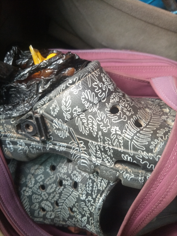 - "Within an open, maroon-colored bag with a visible pink zipper track, two black, patterned clogs are stored" by FM-76VDH2, licensed under CC BY 4.0