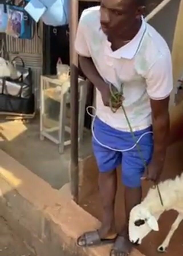 A man in a white polo shirt and blue shorts is holding a small, white sheep on a green leash. He's standing on a red-brown concrete step next to a dirt area. He appears to be attempting to lead the sheep, but it seems hesitant to move. A young woman in a floral print top and black pants stands behind the man, watching. In the background, there is a parked motorbike with a pink cloth draped over it. There are also glimpses of a building with a window and other miscellaneous items.