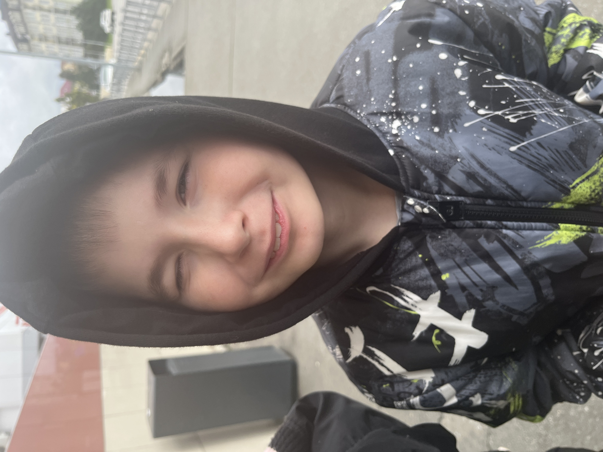 A young male child, approximately 6-10 years old, is depicted in a close-up portrait, winking and smiling at the viewer. He wears a dark, possibly black, hooded sweatshirt with the hood pulled over his head. Beneath it, he wears a zippered jacket with a dark grey/black base featuring abstract white and neon green patterns, including white splatter marks. His left eye is closed in a wink, while his right eye is open, and his mouth is closed in a slight smile. The scene is an outdoor urban environment in Sirius, Russia. In the blurred background to the subject's left, a reddish-brown horizontal panel is visible above a lighter wall section, with a dark grey rectangular object, possibly a utility box or trash receptacle, positioned below it. The blurred background to the subject's right shows an overcast sky over an urban street scene. This includes a light-colored, multi-story building with multiple windows in the distance, partially obscured by green foliage, a light-colored road or pathway bordered by a metal railing, and two light-colored passenger vehicles further down the street. The lighting is diffused, consistent with an overcast day.