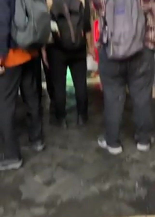 two different sets of people standing outside. In the first scene, there are multiple people standing close together, wearing dark pants. The ground is wet and tiled. In the second scene, there is a group of people waiting, each wearing backpacks. Some are looking down, others are looking ahead. Some people are wearing casual clothing, like jeans and sweaters, while others are wearing formal attire, such as button-down shirts and dress pants. The ground is wet, and there is a building visible in the background. The camera then reverts back to the first scene.