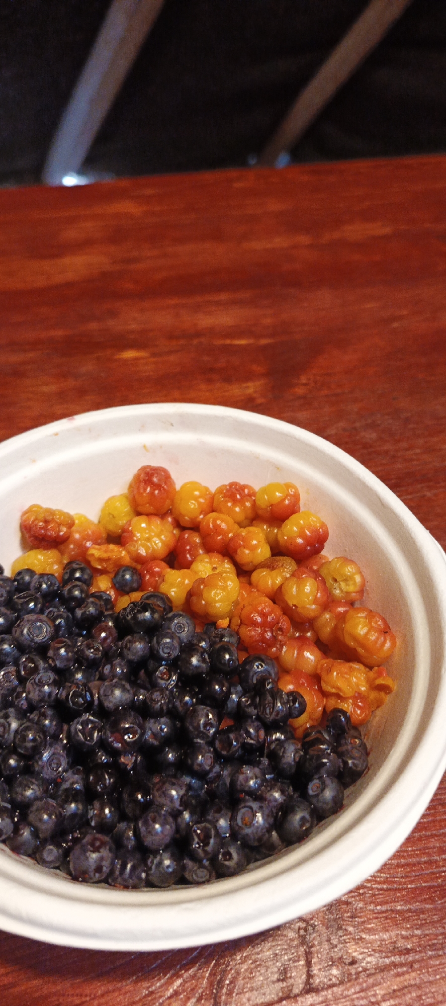 A high-angle, medium shot shows a white paper bowl filled with two types of berries, divided roughly in half. One side is filled with blueberries and the other with cloudberries. The bowl sits on a wooden surface, possibly a table. The location is Naryan-Mar, Russia. No people are visible. The scene appears to be food-related.